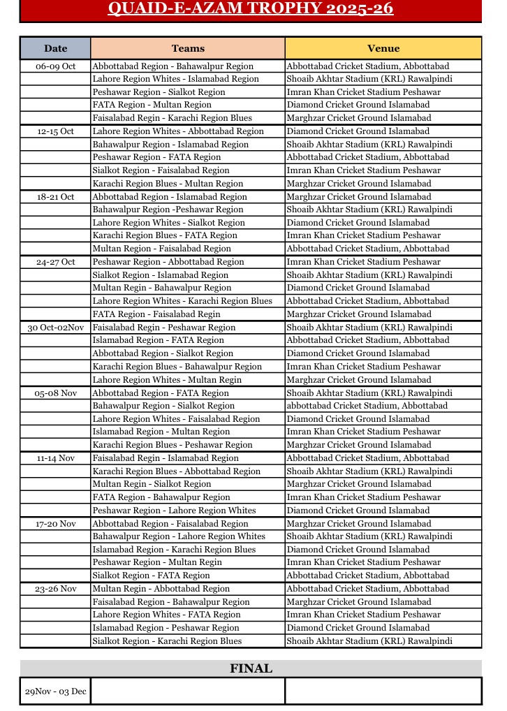 Forthcoming Domestic Cricket Fixtures Details Related Post Quaid-e-Azam Trophy Qualifying Round 2015-2016 On this day 1999 - 113* from Saeed Anwar & 3 superb... What, exactly, were the achievements of the ACSU? Our veteran cricketers deserve more recognition Can Misbah Lead Pakistan to the 2015 WC?